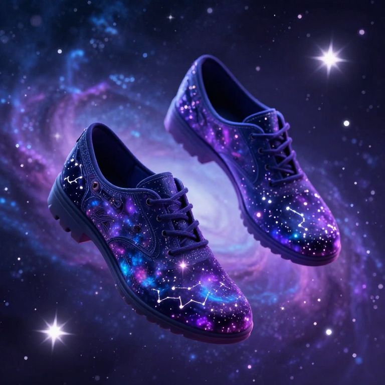 Shoes floating in a surreal cosmic scene, surrounded by glowing stars and nebulae, intricate patterns on the shoes reflecting constellations, vibrant purples and blues, dreamy fantasy environment with soft lighting.