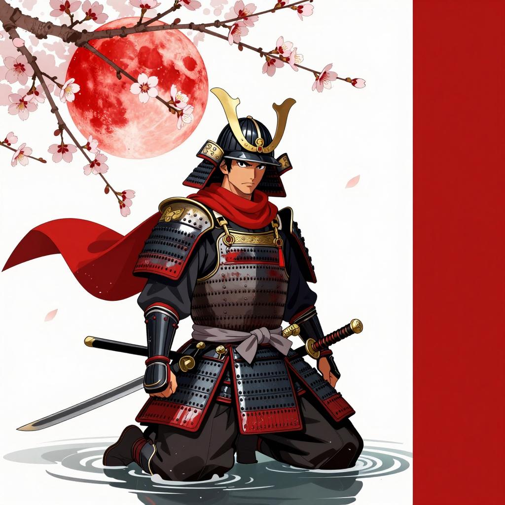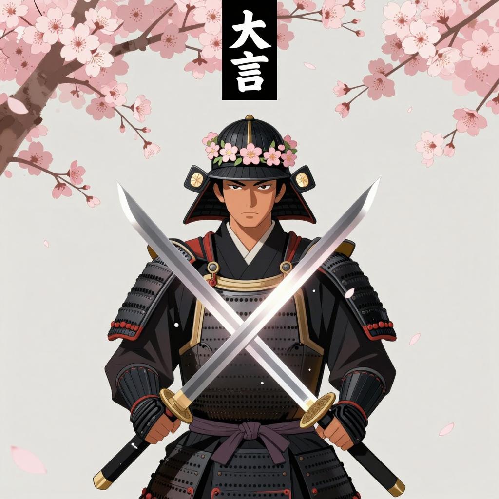 Illustration of a samurai in black armor, surrounded by pink cherry blossoms and falling petals. Two swords cross in front of a large, glowing sword. The samurai wears a cherry blossom wreath on the helmet. Background is light gray. Japanese characters in a black rectangle are at the top center.
