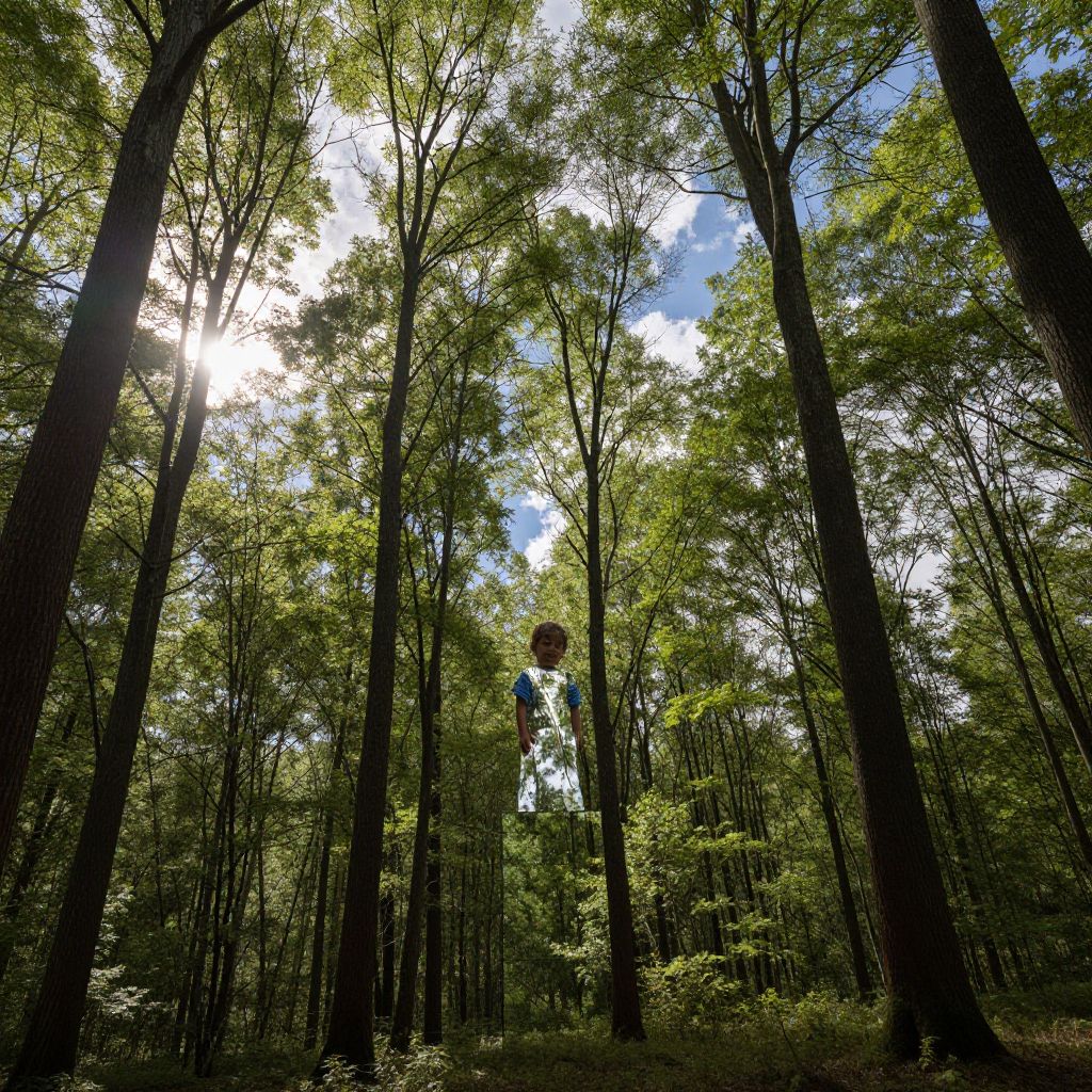 A forest of glass trees reflects the sky in real-time, but instead of the sun and clouds, it mirrors the viewer’s deepest childhood memory.