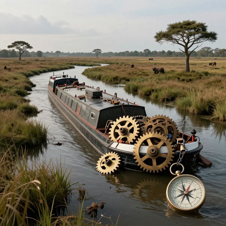 Photograph of a steam-powered narrowboat with large gears and a compass, navigating a grassy river in a savanna landscape with distant trees and grazing