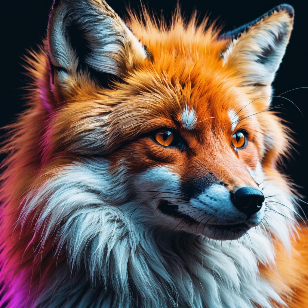 Ultra-detailed digital artwork of a fox with vibrant retrowave colors, featuring anatomically accurate vulpine features and flowing fluffy fur. The close-up portrait captures the fox's intense amber eyes and expressive face with a synthwave-inspired neon light effect on the edges.