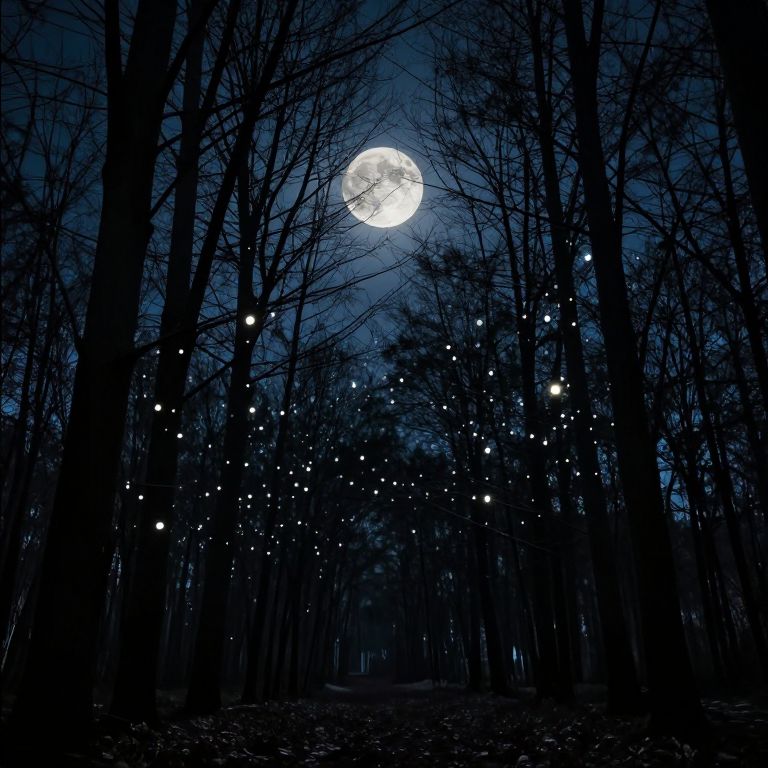 A photograph of a dark, moonlit forest at night. Tall, leafless trees with black silhouettes dominate the foreground. The bright, full moon shines brightly in the deep blue sky, casting a soft glow. Numerous small, glowing white lights, resembling fireflies, are scattered throughout the trees, creating a magical, ethereal atmosphere. The ground is dark and shadowed, with a subtle path leading deeper into the forest. The image has a slightly surreal, almost fantasy-like quality due to the luminous fireflies.