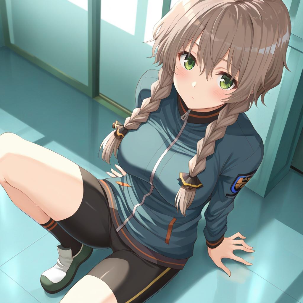 Amane suzuha, steins;gate, 1girl, yellow eyes, green eyes, brown hair, long hair, twin braids, medium breasts, bike shorts, by artist kanaria hisagi, illustrious