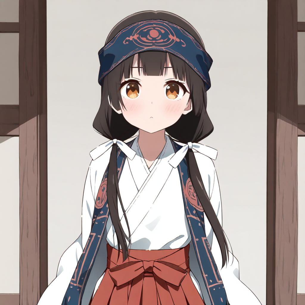 Illustration of a young anime girl with long black hair styled in low twintails, brown eyes, and blunt bangs. She is dressed in a traditional Japanese miko outfit, featuring a white kimono top and a red hakama skirt tied with a large bow. She wears a blue headband with a red pattern and stands in front of a simple background with wooden beams.