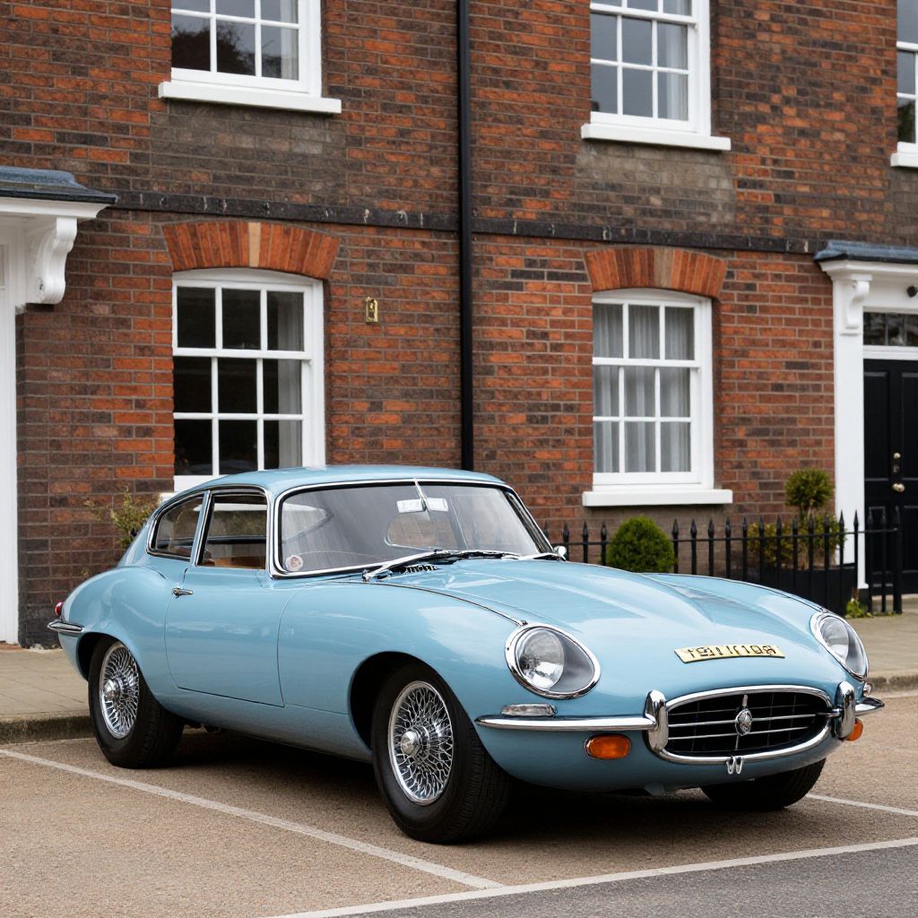 Shiny pale-blue 1965 Jaguar E-Type S1 4.2 DOHC Coupe, fully restored and featuring a manual transmission, is elegantly parked in front of a brick house with white-framed windows, showcasing its classic design and pristine condition.