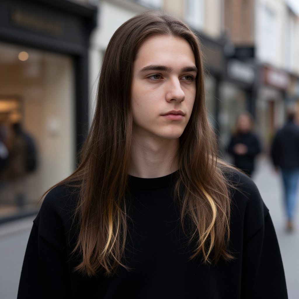 Photograph of a young man with long, straight brown hair that has blonde highlights at the ends. He's wearing a black sweatshirt and has a serious, thoughtful expression. The background is slightly blurred, showing a city street with storefronts and people walking. The image has a natural, slightly moody tone with soft lighting.