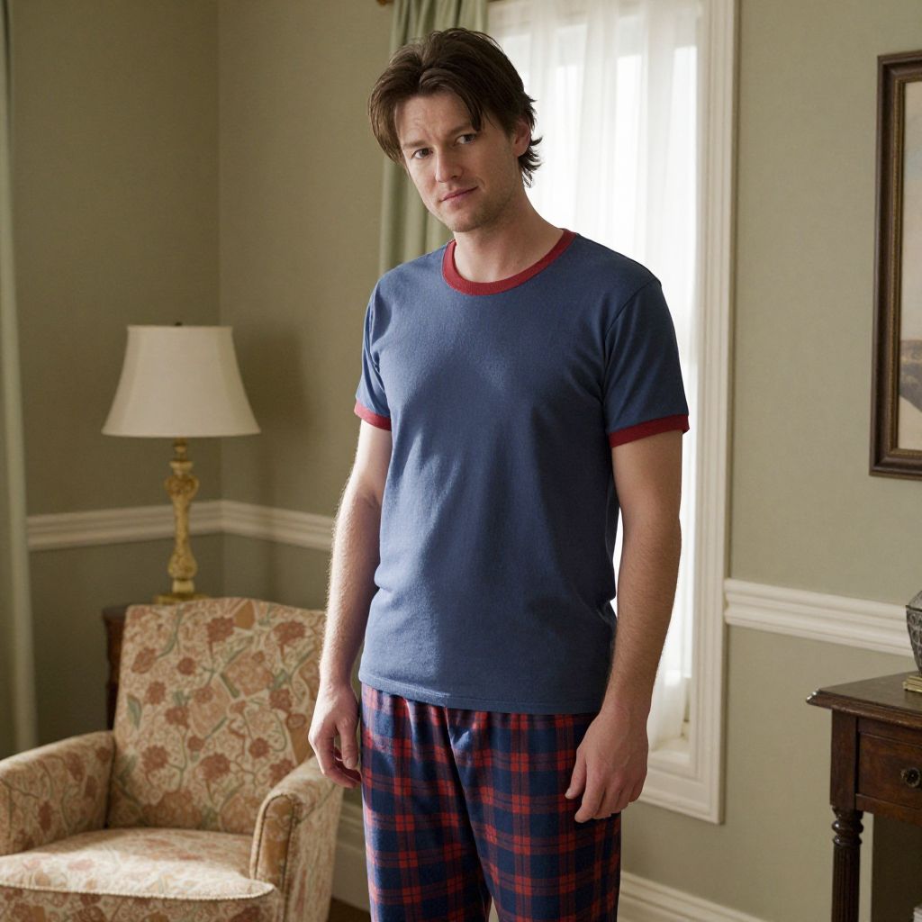 A man with short brown hair, wearing a blue shirt with a red collar, paired with blue and red pajama pants, standing in a cozy, softly lit room with a warm, inviting atmosphere. The scene is slightly nostalgic, with sunlight streaming through a window, highlighting the textures of the clothing and the man's relaxed expression. He looks slightly amused, as if enjoying a quiet moment of comfort and simplicity.