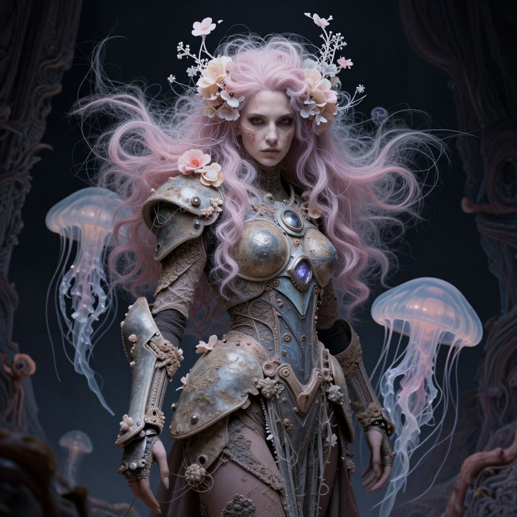 Digital fantasy artwork of a pale-skinned, pink-haired warrior woman with flowers in her hair, wearing ornate silver armor, surrounded by glowing jellyfish
