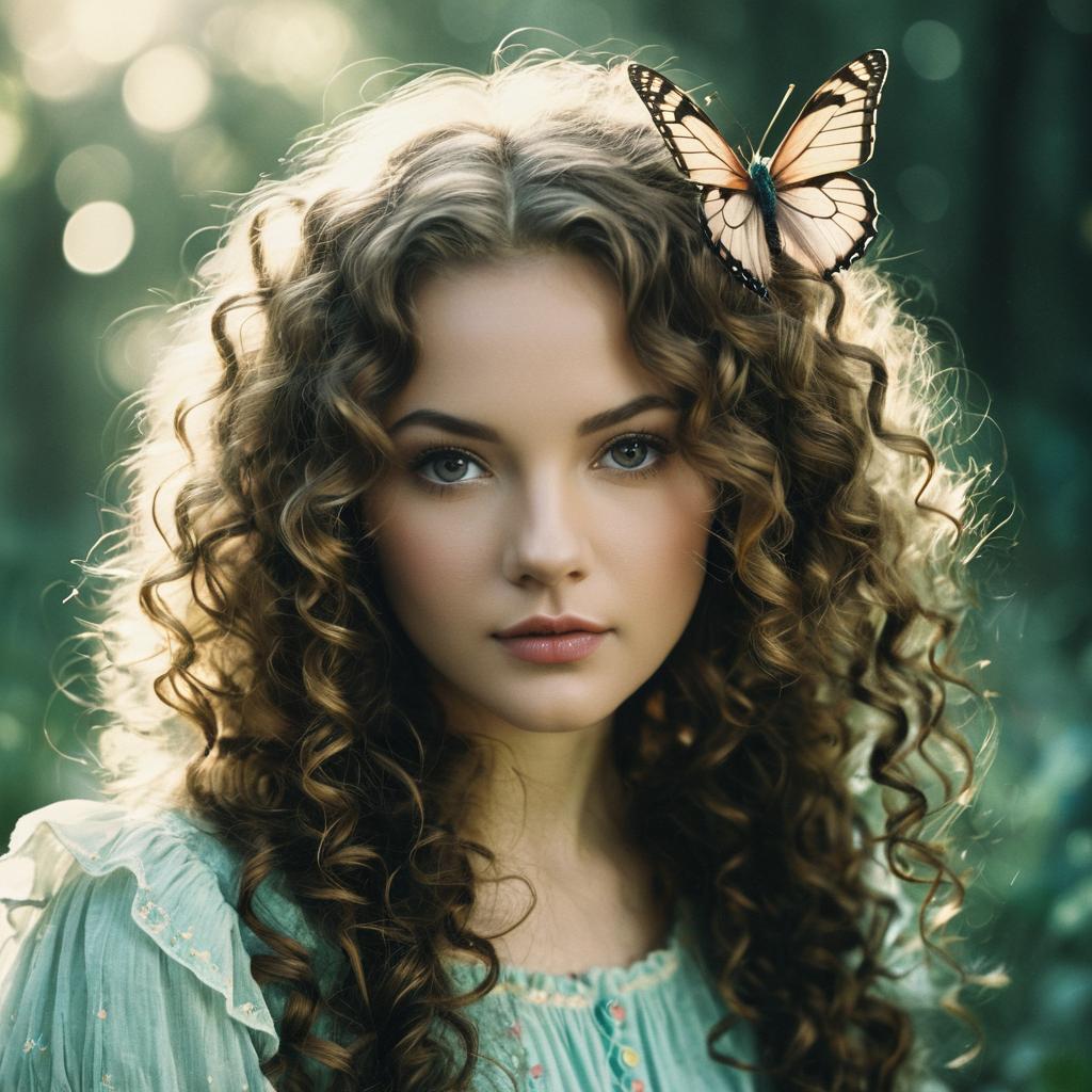 An imaginative young fairy, age 19 with a loose curls, portrayed in a whimsical style. The photo has a soft pastel illustration style with diffused sunlight and butterfly accents for a sharp and focused look.