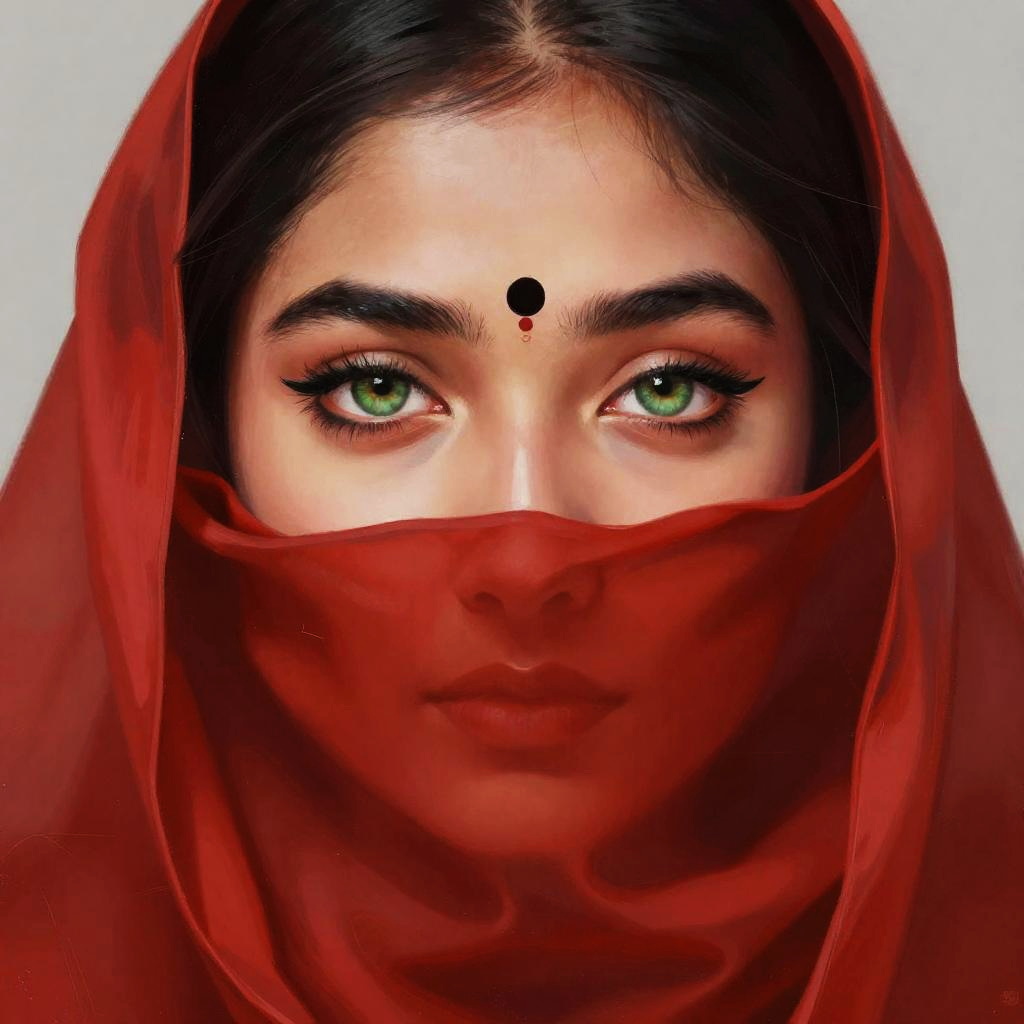 This is a close-up digital painting of a person's face, focusing on their green eyes with dark eyeliner and eyelashes. They're wearing a red cloth that covers the lower part of their face, leaving only their eyes and a black bindi on their forehead visible. The red cloth has smooth, flowing lines and a slightly glossy texture. The background is a simple gray. The artwork has a realistic yet slightly stylized feel.