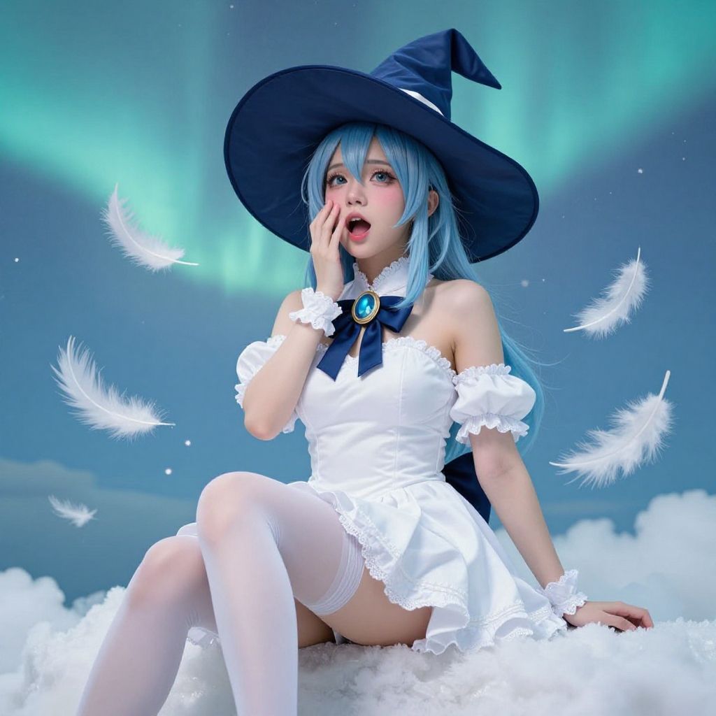 Masterpiece, 1girl, solo, elaina, (blue_style_costume, majo_costume, witch_hat, brooch:1.6), small_breasts, falling_feathers, aurora, open_mouth, blush, hand_on_own_face, sitting, white_dress, blue_ribbon, white_legwear, blue_sky, cloud