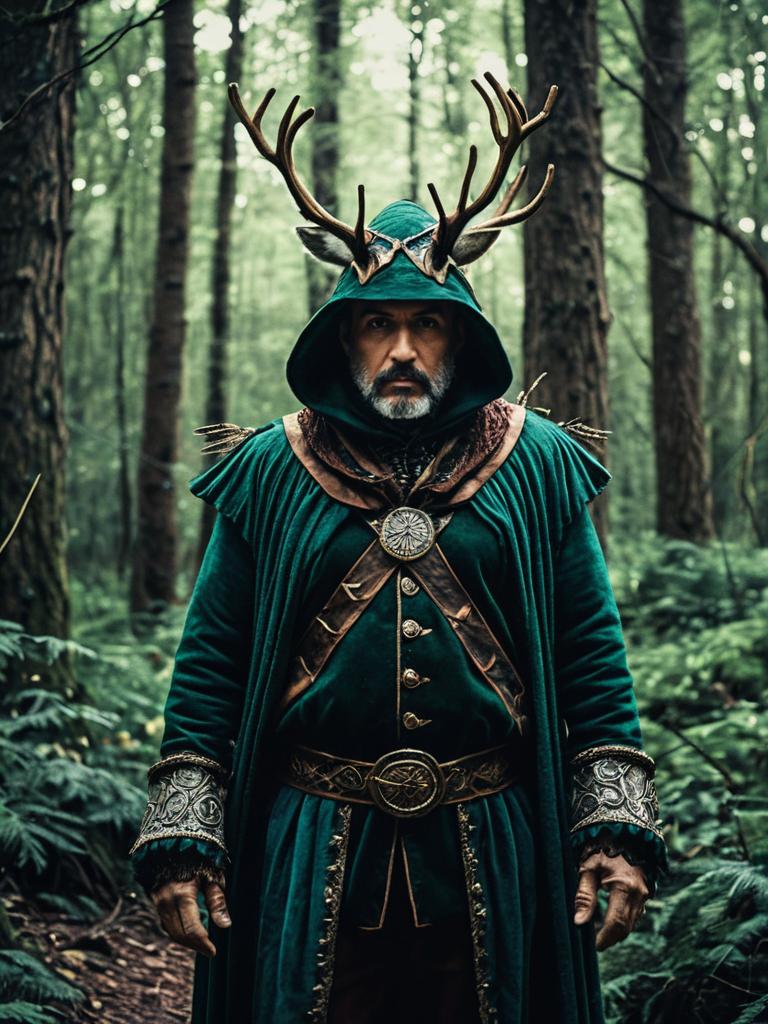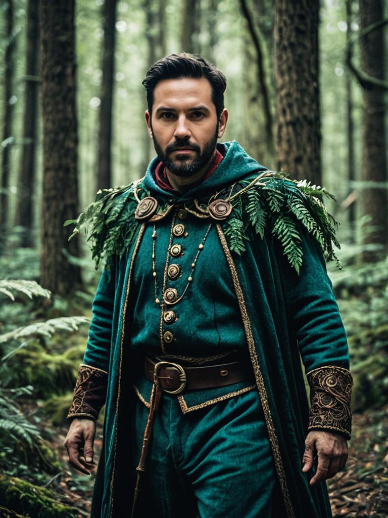 Man in Enchanted Forest Costume, cinematic realism, nature-inspired portrait