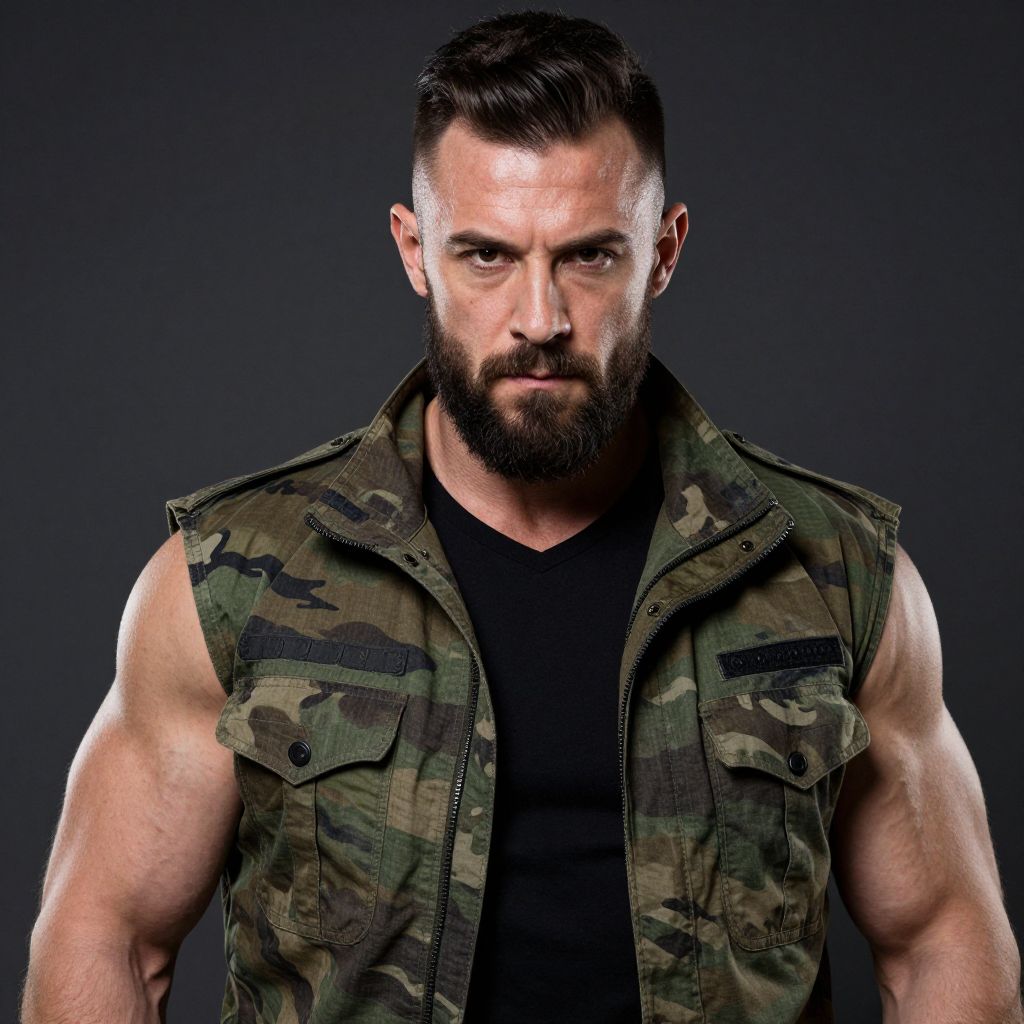 Photograph of a muscular, bearded man with short dark hair, staring intensely at the camera. He's wearing a black t-shirt under a green and brown camouflage military-style jacket. His arms are prominently flexed, showing off his muscular build. The background is a solid dark gray, which makes him stand out. The lighting highlights his facial features and muscles.
