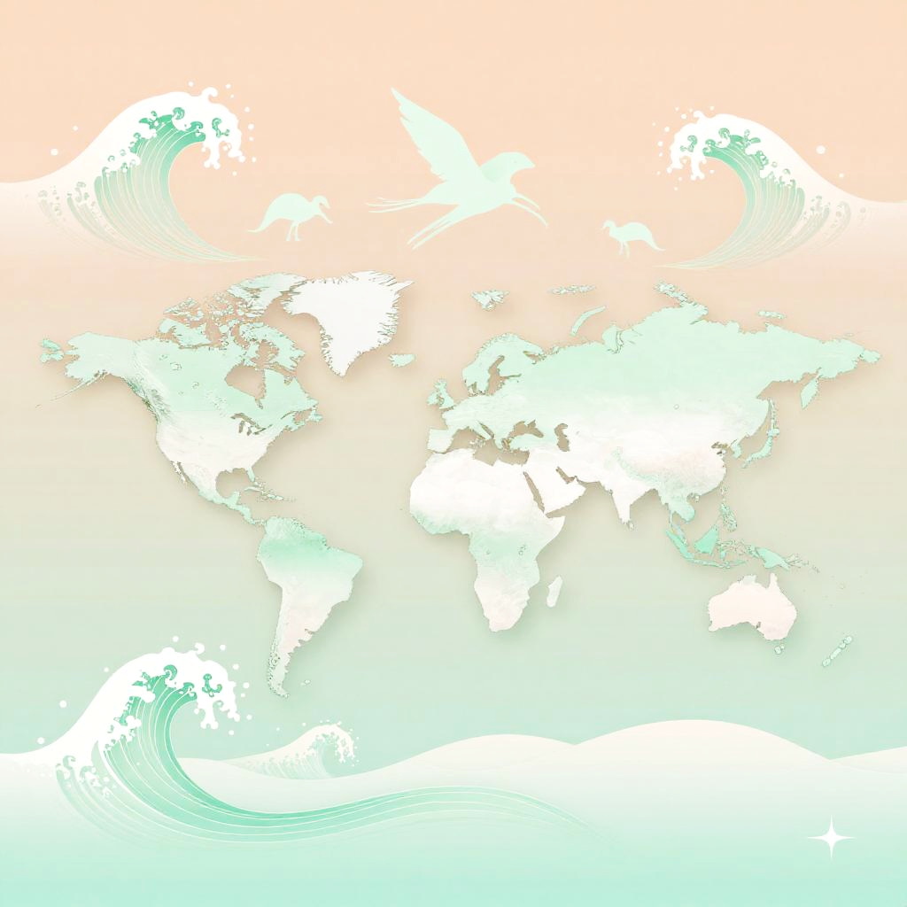 Photo illustration from a world in the clouds, in the style of James R. Eads, soft peach and mint green, featuring psychedelic waves and mystical animals, fluid abstract