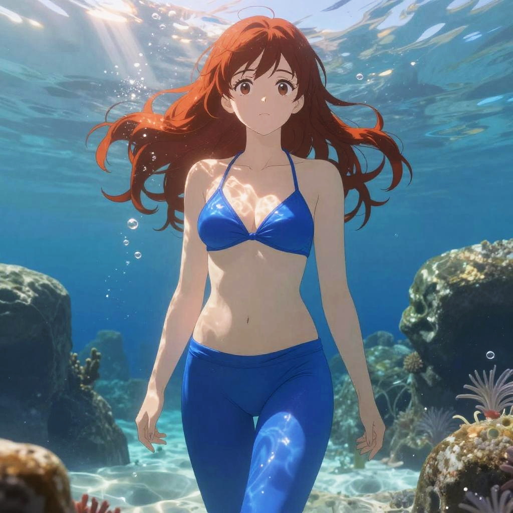 An anime style young woman with long flowing auburn hair, wearing a shiny blue bikini and leggings, standing in a serene underwater environment illuminated by soft sunlight filtering down from the surface, surrounded by gentle rock formations and subtle bubbles, glowing highlights on skin and fabric, warm and vibrant color tones, detailed shading and reflections, calm and peaceful atmosphere