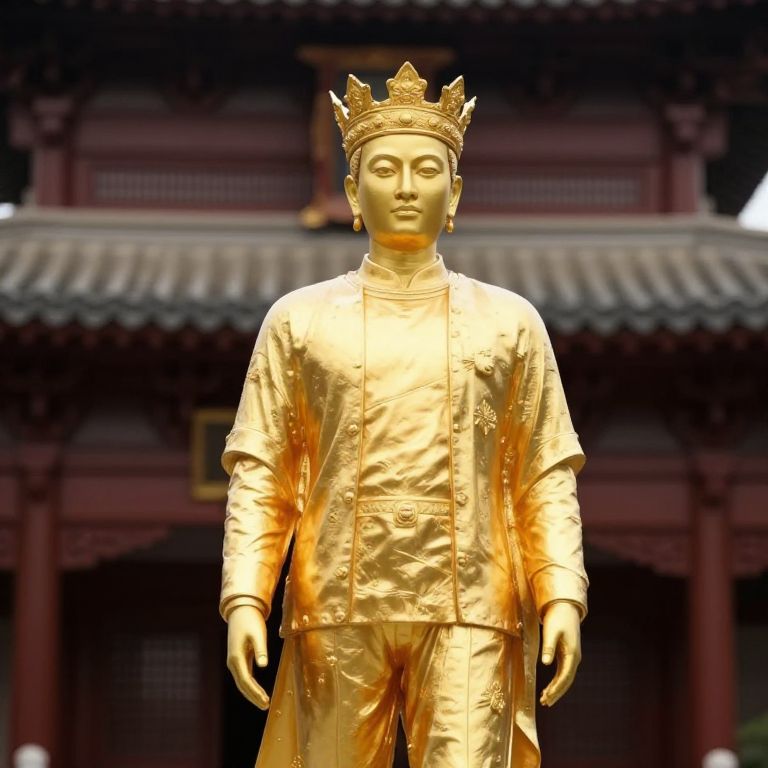 Golden statue of a person wearing a gold outfit with a golden crown on their head. The statue is standing in front of a building with a chinese style architecture.