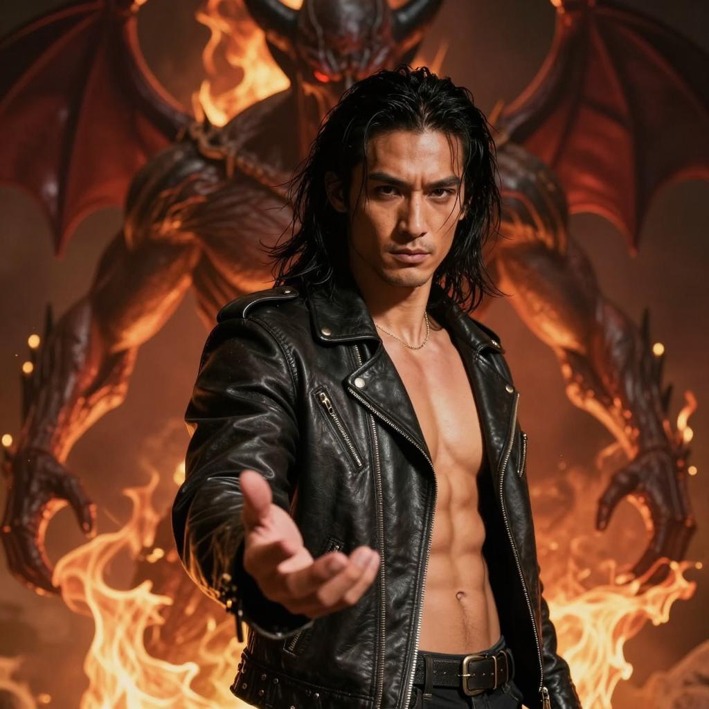 This image features a man with long hair and a muscular physique wearing a leather jacket, extending his hand, with a powerful, artistically rendered demonic figure and flames in the background.