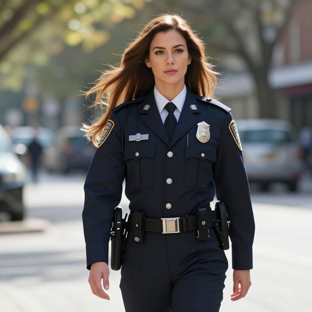 A woman with long, flowing brown hair wearing a crisp police uniform, including a dark blue jacket with a badge on the chest, a white shirt with a tie, and dark trousers. She stands confidently in a city street, sunlight streaming through the trees behind her, with a calm and professional expression. The scene is realistic and detailed, capturing the elegance and authority of a police officer in uniform.