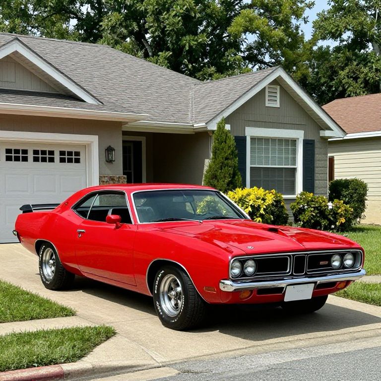 Vibrant red 1971 Plymouth Road Runner muscle car parked prominently in front of a suburban home, showcasing its classic design and polished chrome details against a backdrop of manicured greenery and residential architecture.