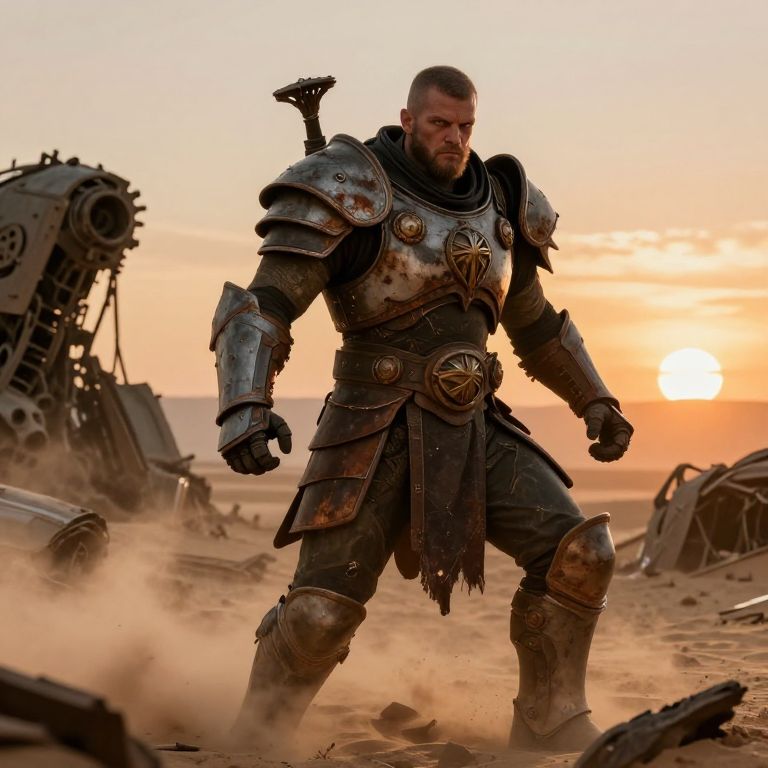 Gerlock as a legendary warrior in a post-apocalyptic wasteland, dusty desert with remnants of ruined machines, battered armor with rust and scars, fierce gaze, dramatic sunset sky, dust storms swirling around, powerful stance, heroic vibe.