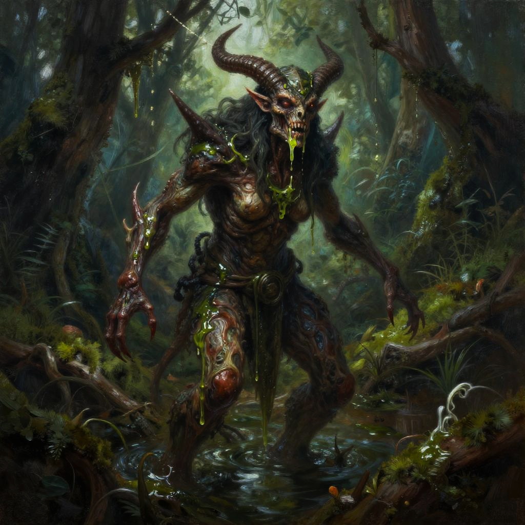 Warhammer fantasy RPG style venomous swamp hag, highly detailed oil painting with dark moss green and murky brown shades. Set in a mystical forest with warty skin and dripping poisonous slime, evoking a dark and ominous atmosphere.