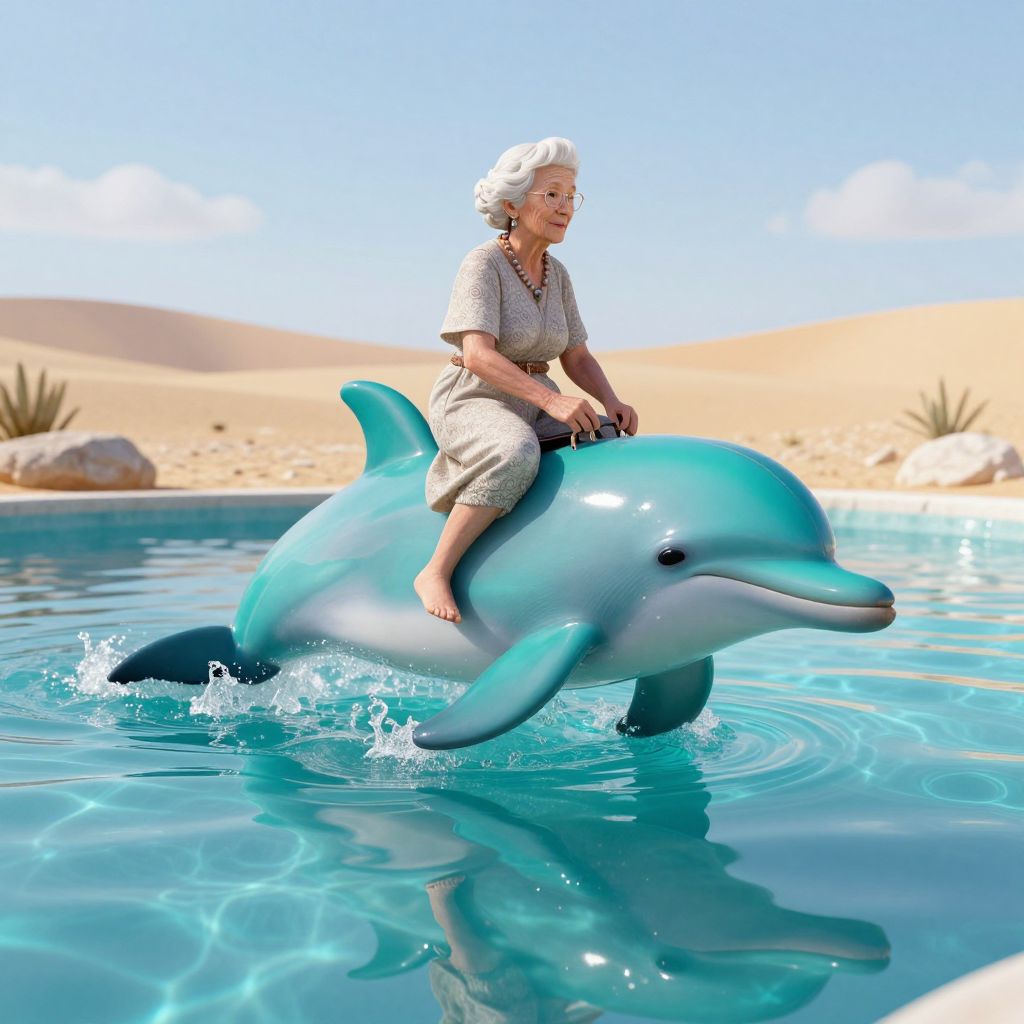A surreal 3D-rendered scene depicts an elderly woman elegantly riding a vibrant turquoise dolphin through a tranquil pool of liquid glass, set against a desert backdrop under a clear sky, blending digital artistry with dreamlike reflections.