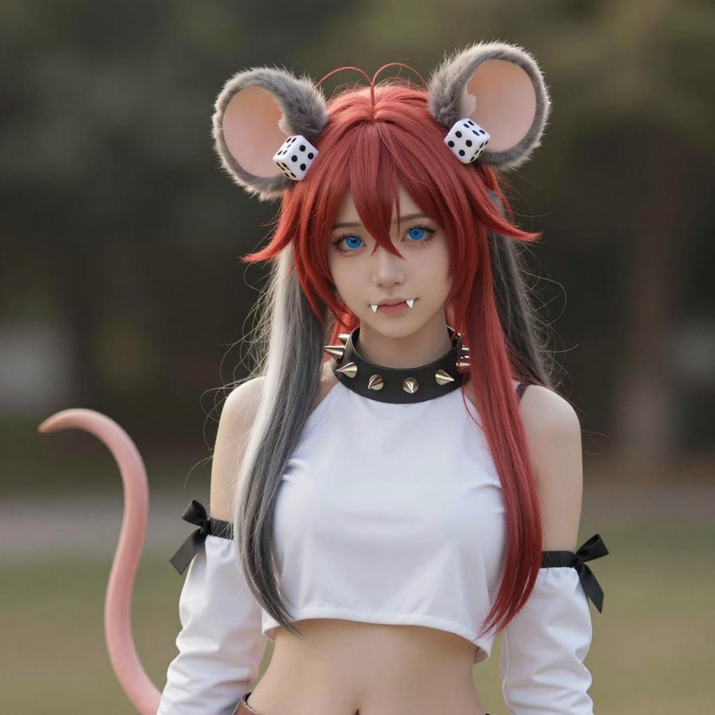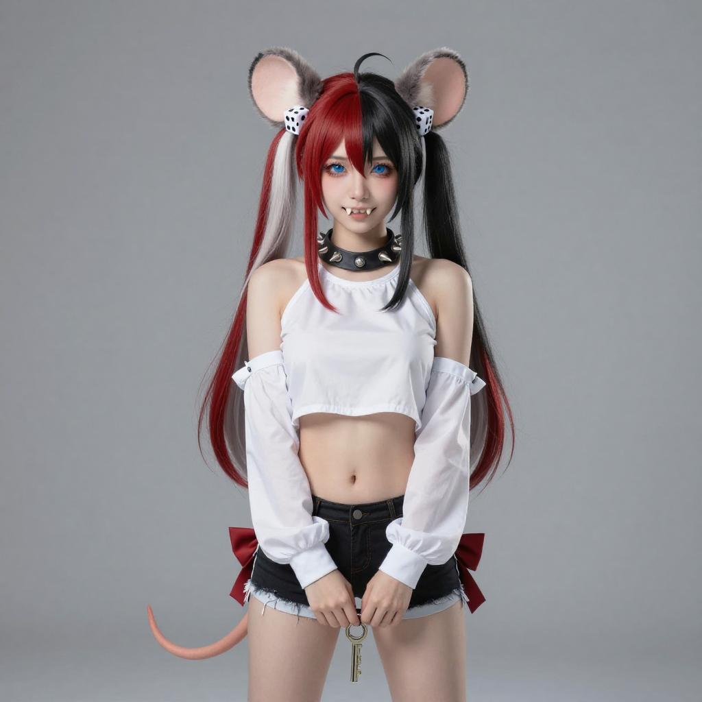 Photo-realistic cosplay photo of person in mr. squeaks (hakos baelz) costume. Full body. Standing. Full length. 1girl, mouse girl, mouse ears, mouse tail, animal ear fluff, sharp teeth, tail bow, blue eyes, hair between eyes, red hair, streaked hair, black hair, white hair, long hair, dice hair ornament, twintails, medium breasts, navel, white shirt, spiked collar, bare shoulders, detached sleeves, virtual youtuber, virtual youtuber, mouse (animal), midriff, key, professional photoshoot