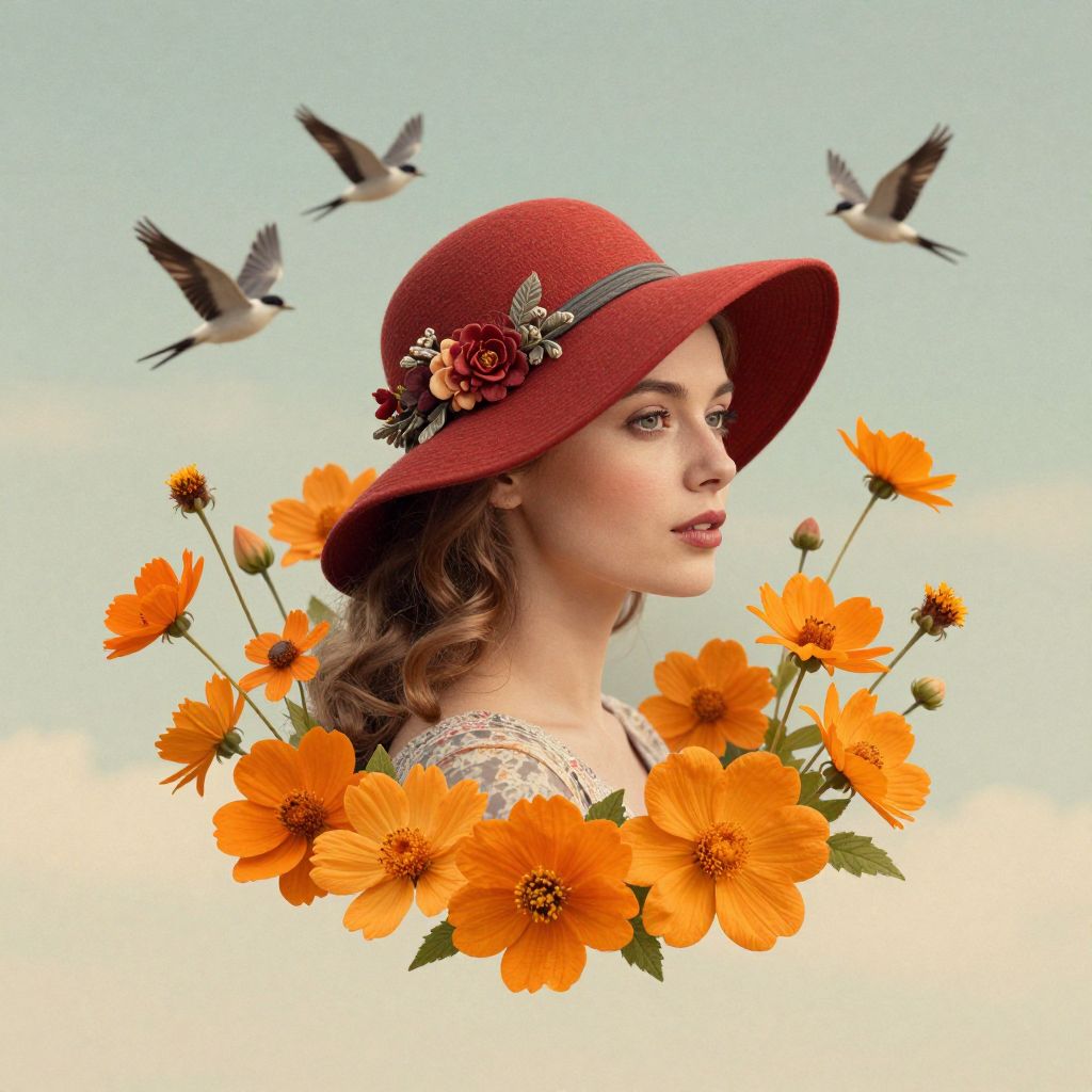 A vintage-inspired digital collage by Catrin Welz-Stein featuring a woman in a red hat adorned with floral details, set against a serene backdrop of flying birds and vibrant orange flowers, evoking a nostalgic and romantic atmosphere.