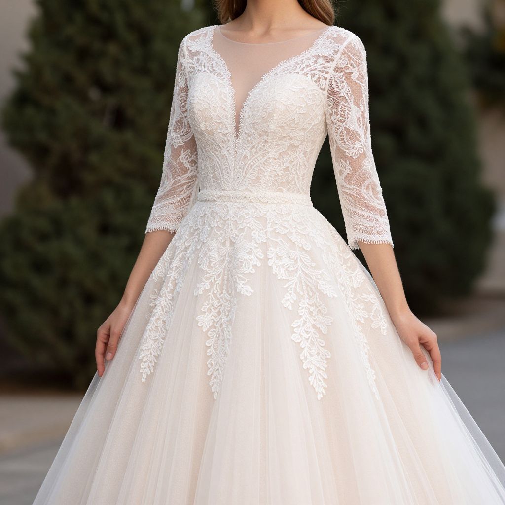 A woman elegantly showcases a Blunny 2021 blush lace and tulle princess wedding dress featuring 3/4 sleeves, captured in high-definition detail against a serene outdoor backdrop with soft natural lighting, emphasizing the dress's delicate craftsmanship and flowing silhouette.