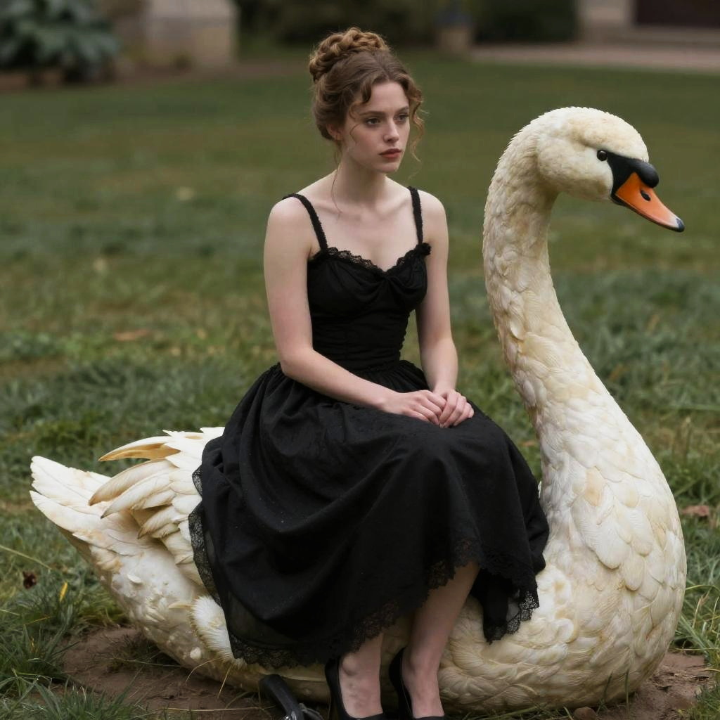 Photograph of a fair-skinned, blonde woman with wavy hair, wearing a black, lace-trimmed, sleeveless dress and black high heels. She sits elegantly on a large, ornate, white swan statue with a black beak and orange markings. The background is a blurred, grassy garden with green foliage. The woman's red lipstick and poised expression add a touch of sophistication. The swan statue features intricate, swirling patterns on its body, contrasting with the woman's simple, yet stylish, black dress.