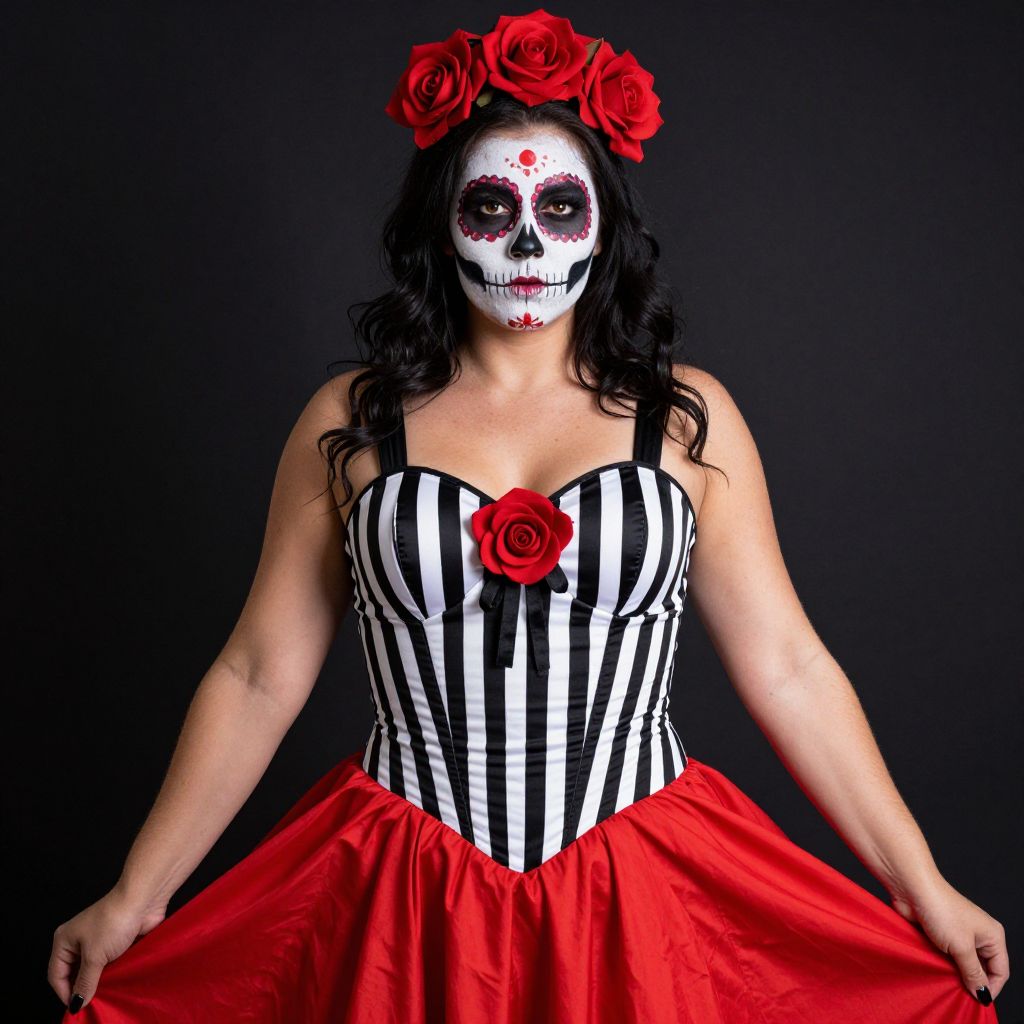 Lady of the Dead costume featuring a plus-size woman wearing a striking black and white striped corset dress with a red rose accent at the center, complemented by a vibrant red skirt and a sugar skull face paint adorned with red roses in her hair, exuding a bold and festive Halloween theme.