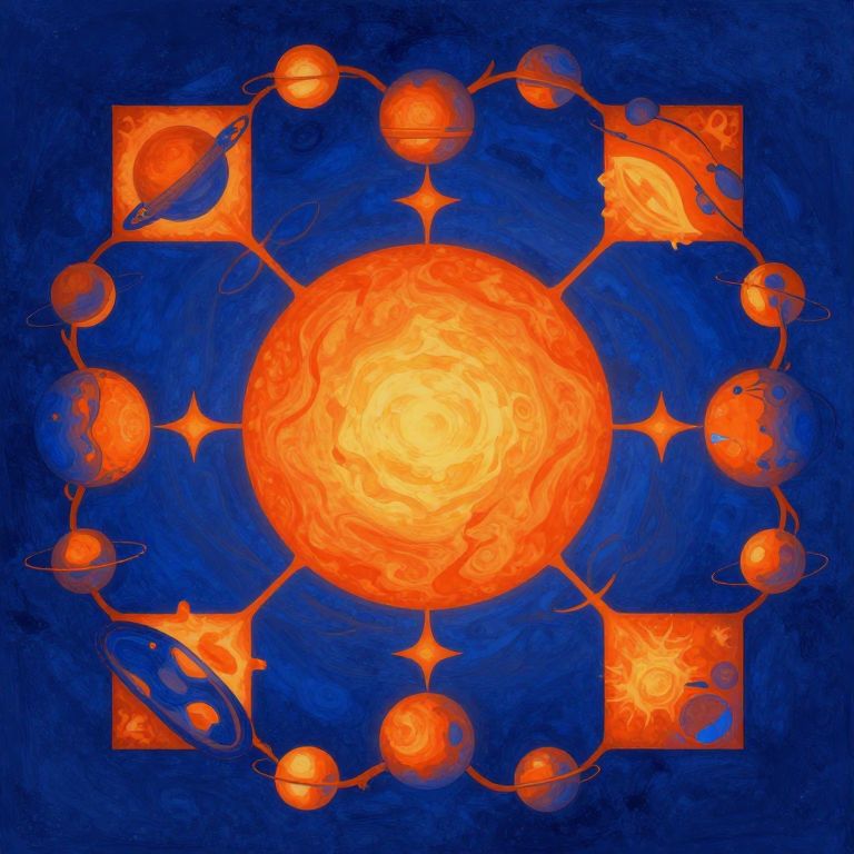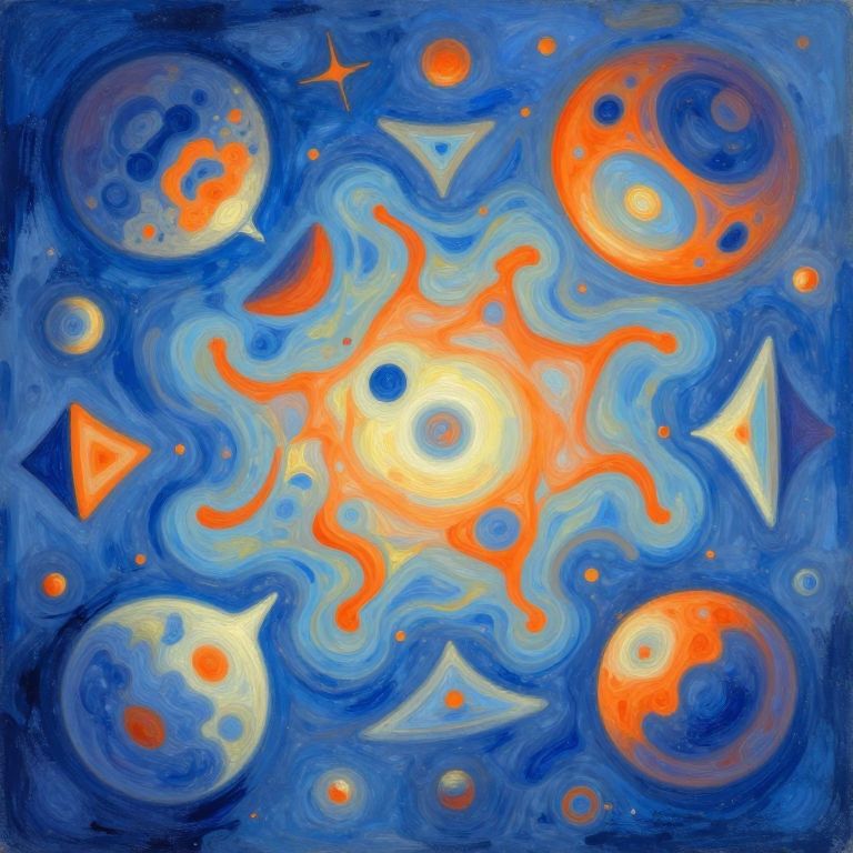 Visualize an entrancing abstract geometric composition reminiscent of Wassily Kandinsky's spiritual paintings, showcasing a lively interaction between vivid red circles and blue triangles arranged in a complex spiral formation against a dark backdrop. The striking colors emanate energy as they engage with one another, generating a sense of motion and strain within the artwork. This evocative piece captures an extensive range of emotions, from the exhilarating intensity of the bold hues to the tranquil depth of the void surrounding them, encouraging viewers to delve into their own inner realms while reflecting on the intricate relationship between form and emotion.