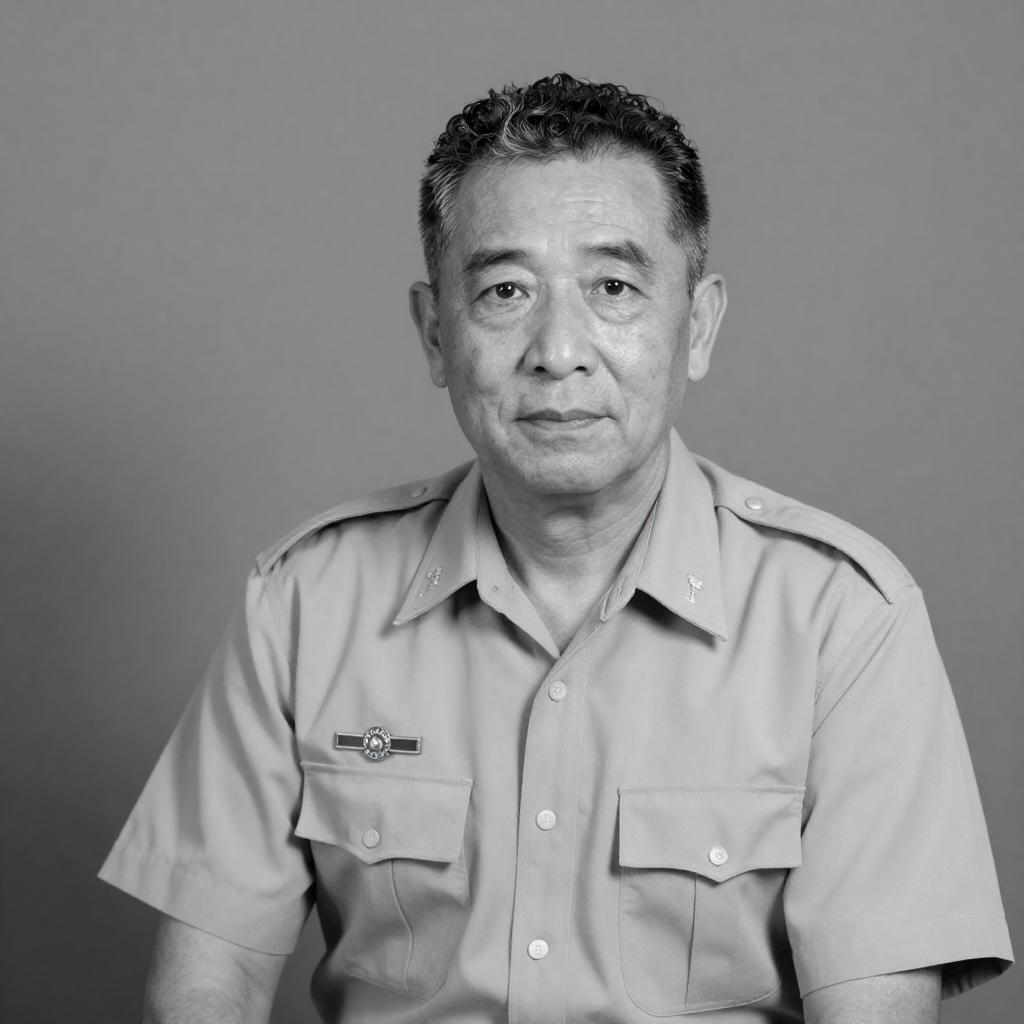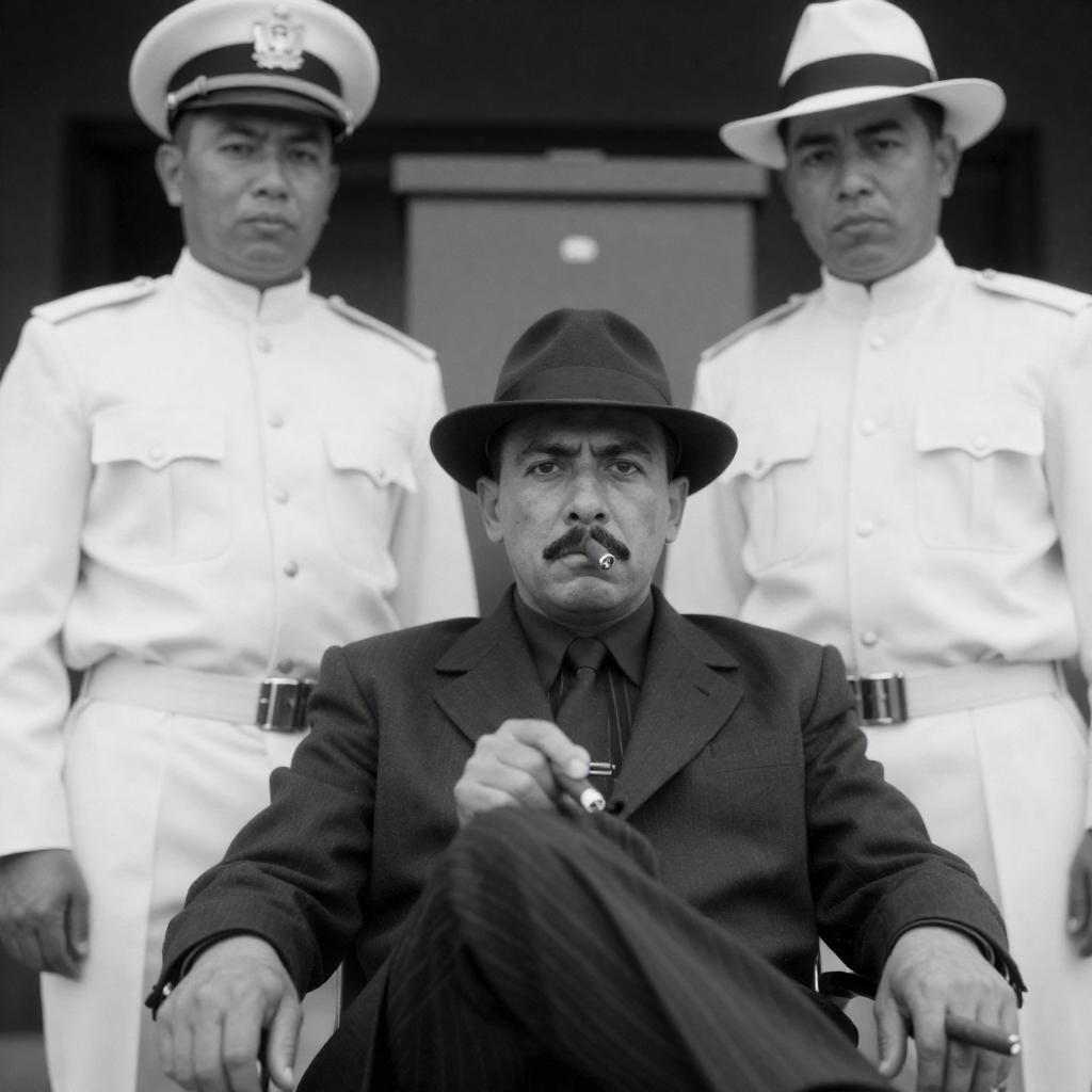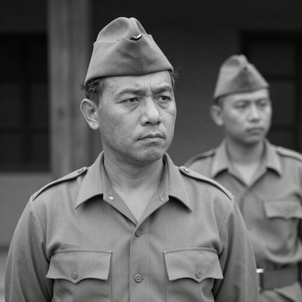 Black and white photograph of a middle-aged man with curly hair, wearing a light-colored military uniform and peaked cap. He has a serious expression, looking slightly to the side. A second man in a similar uniform and cap stands blurred in the background. A wooden beam is behind them.