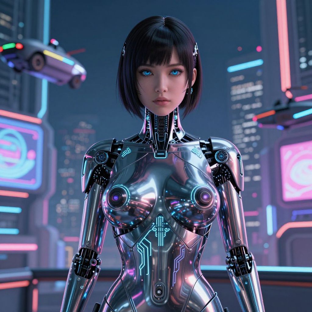A sleek, cyberpunk android woman with deep blue eyes and a neutral, serene face stands in a neon-lit futuristic city at night, her body crafted from polished chrome panels that reflect the city lights, with smooth, clean lines and glowing circuit patterns embedded in her skin-like surface, set against a backdrop of flying vehicles and holographic advertisements in a high-tech dystopian environment.. The woman has big tits and cute face