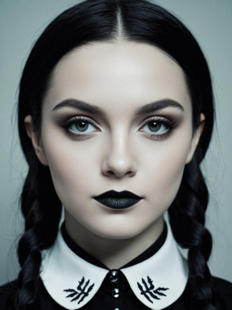 Woman in Wednesday Addams Costume, close-up detailed headshot with pale makeup