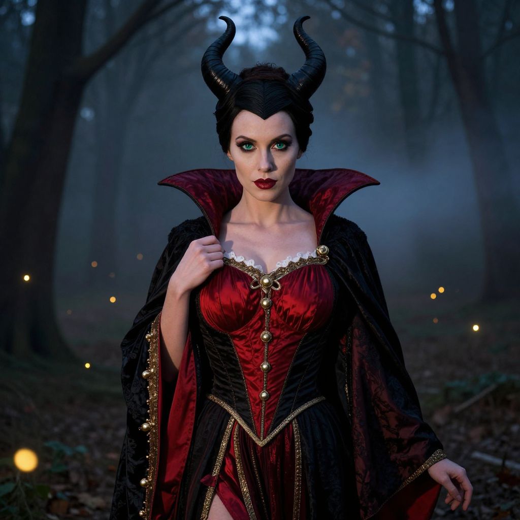 A photorealistic portrait of a young woman in a detailed 'Maleficent Halloween costume' with a dark, flowing red and black gown, golden accents, and a dramatic winged cape, standing in a misty forest at twilight with fireflies glowing around her. Her face is serene yet mysterious, with sharp cheekbones, high cheekbones, and deep emerald eyes that reflect the ambient light.. The woman has big tits and cute face