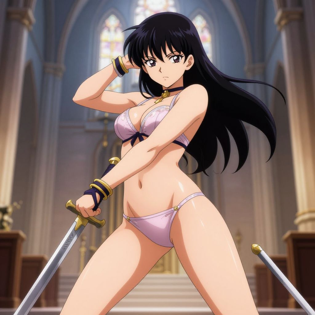 An anime-style illustration showcasing a woman in seductive lingerie paired with a sword, striking a formidable pose inside a church setting, melding themes of sensuality and strength.