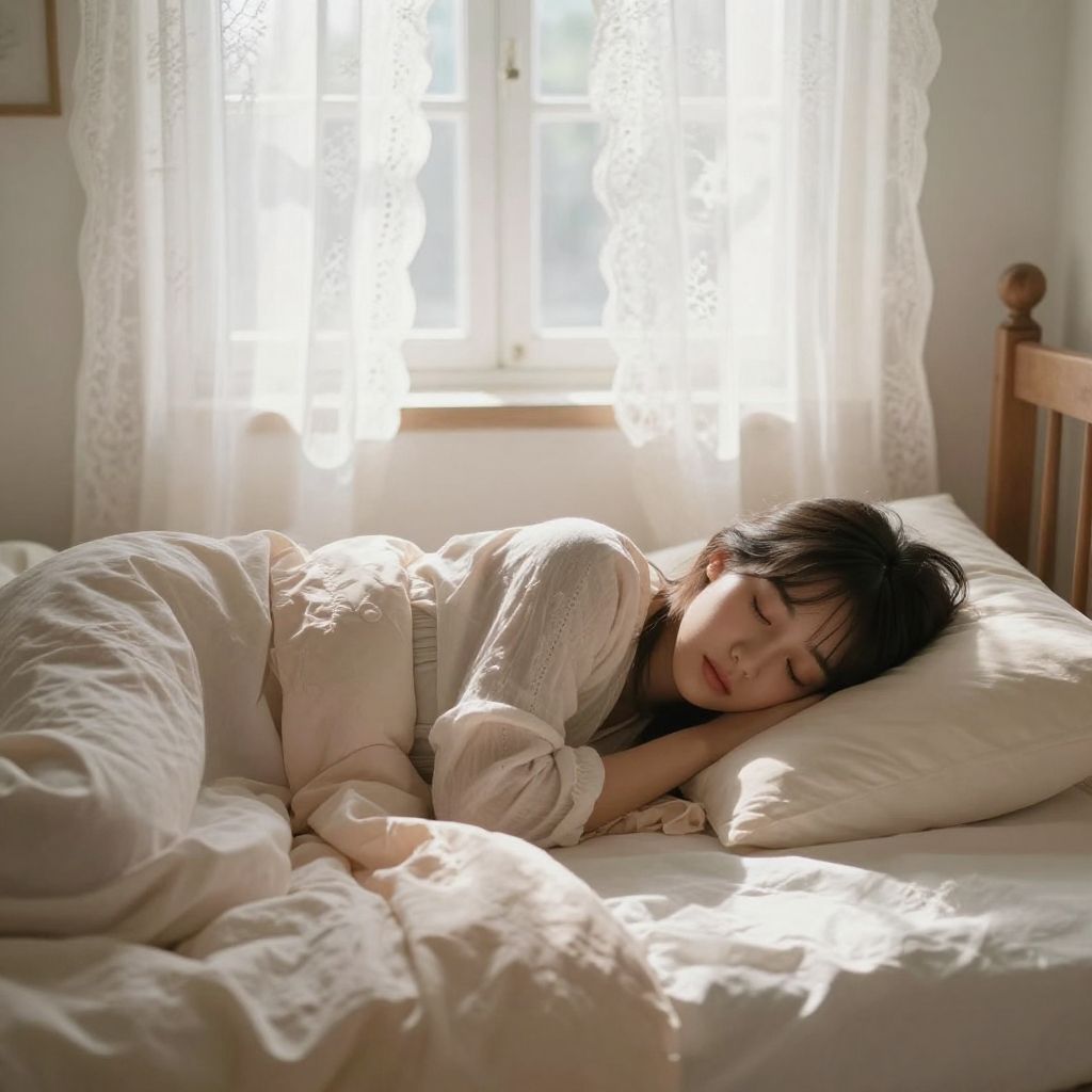 Girl sleeping on bed in a cozy sunlit room, soft pastel colors, gentle morning light filtering through lace curtains, serene and peaceful atmosphere, detailed textures