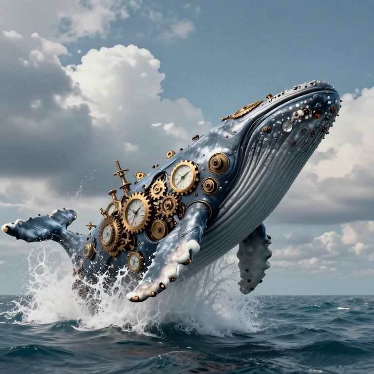 A steampunk-inspired digital artwork depicts a mechanical whale emerging from the ocean, adorned with intricate gears and clocks, as it breaches into a dramatic sky filled with fluffy clouds, blending the surreal with the fantastical in high-definition detail.