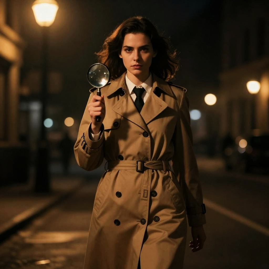 Photograph of a determined woman with wavy brown hair, wearing a tan trench coat and black tie, holding a magnifying glass in her right hand. She stands in the center of a dimly lit, narrow urban street at night, with blurred street lamps and buildings in the background. The street is wet, reflecting the warm glow of the lamps. The image has a dramatic, noir-style lighting, emphasizing her focused expression and the mystery of the scene. The magnifying glass is held up to her eye, adding a detective-like atmosphere.