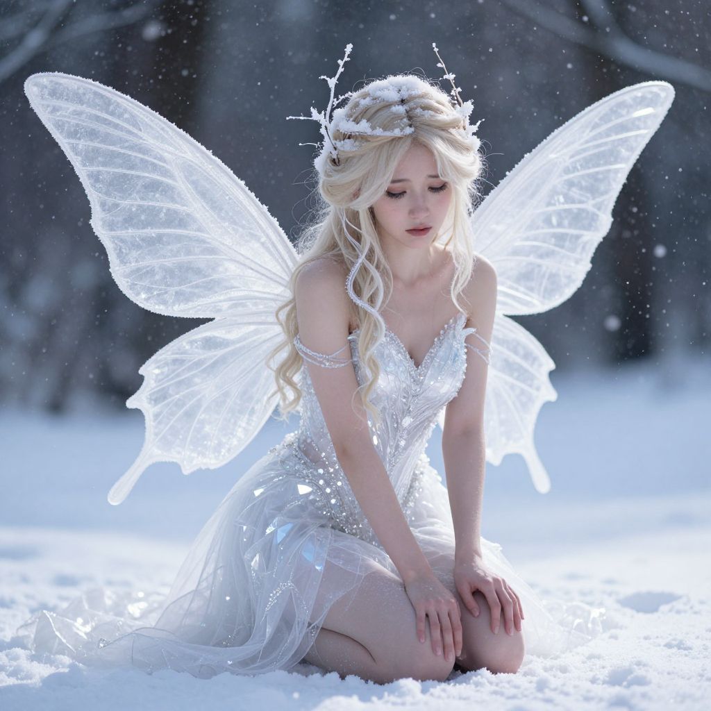 Photograph of a fair-skinned, blonde woman with ethereal, translucent wings, wearing a sparkling white dress, kneeling in a snowy forest.