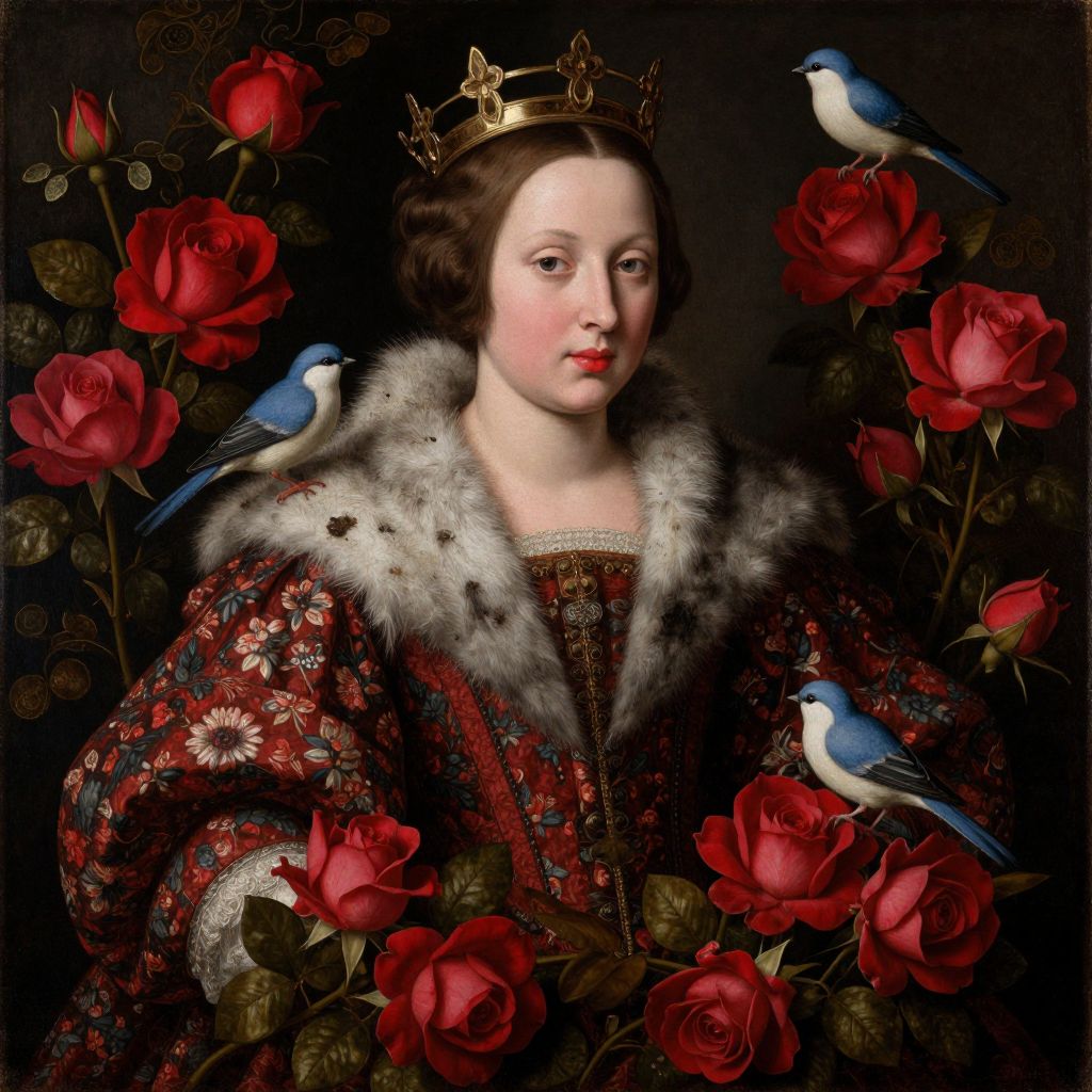 The image is a highly detailed, ultra-realistic Renaissance-style oil painting featuring a full-body portrait of a woman. She is adorned with a crown and a richly textured fur collar, both in shades of white and gray. Her attire is a dark red garment with intricate floral patterns, complemented by a red lipstick that adds a striking contrast to her fair skin. Surrounding her are vibrant red roses, their petals and leaves meticulously rendered, creating a lush, natural backdrop. Small birds with blue and white plumage are perched on her shoulders and head, adding a whimsical touch to the composition. The lighting is dim yet strong, casting dramatic shadows and highlighting the textures and colors of the woman's clothing and the surrounding roses. The overall composition is balanced, with the woman centrally positioned, and the birds and roses framing her in a symmetrical arrangement. The use of fine detail and sharp focus enhances the realism, making the scene appear almost tangible.