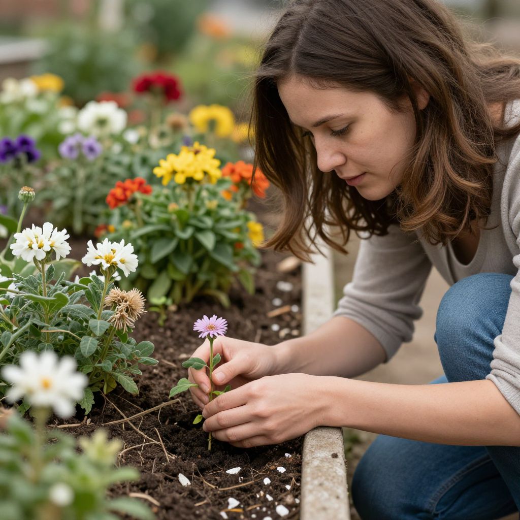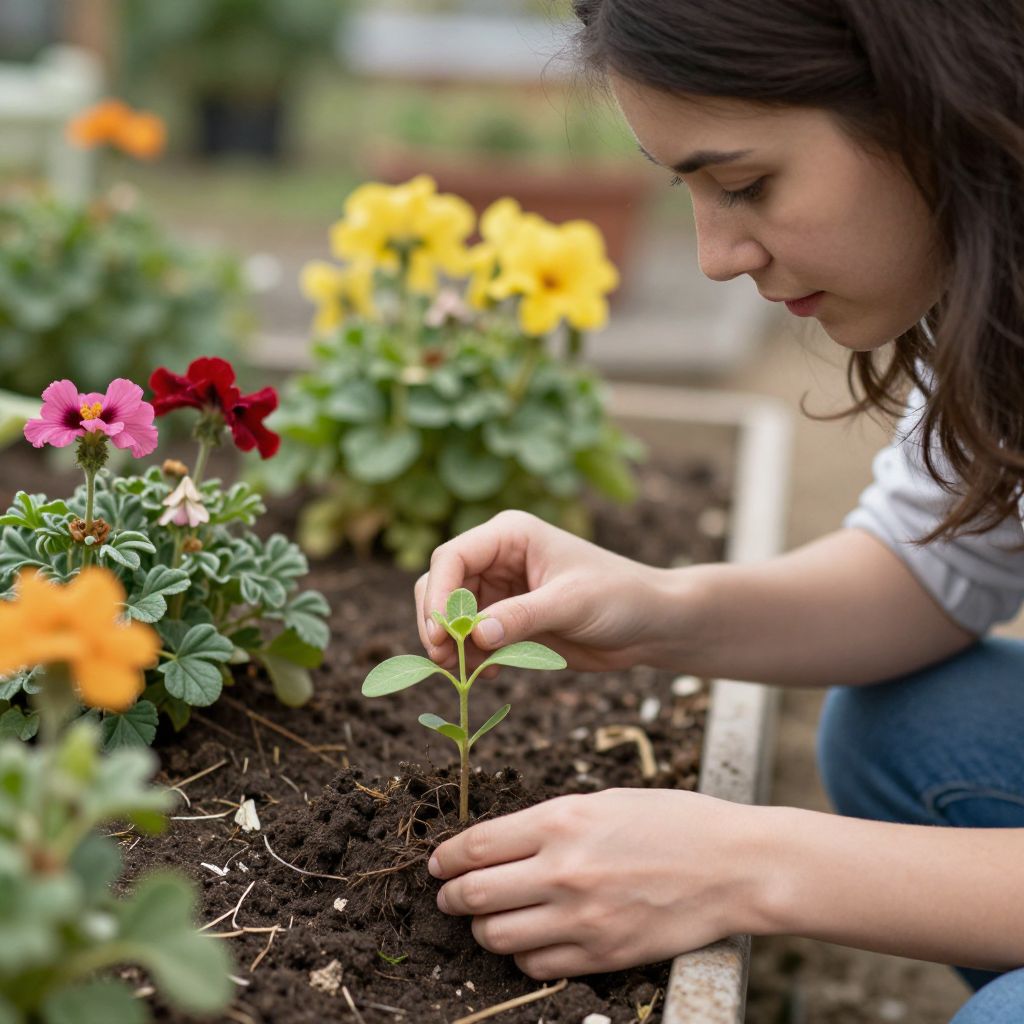 Photograph of a young woman with dark hair, wearing a white shirt and blue jeans, planting a small green seedling in a garden bed with vibrant