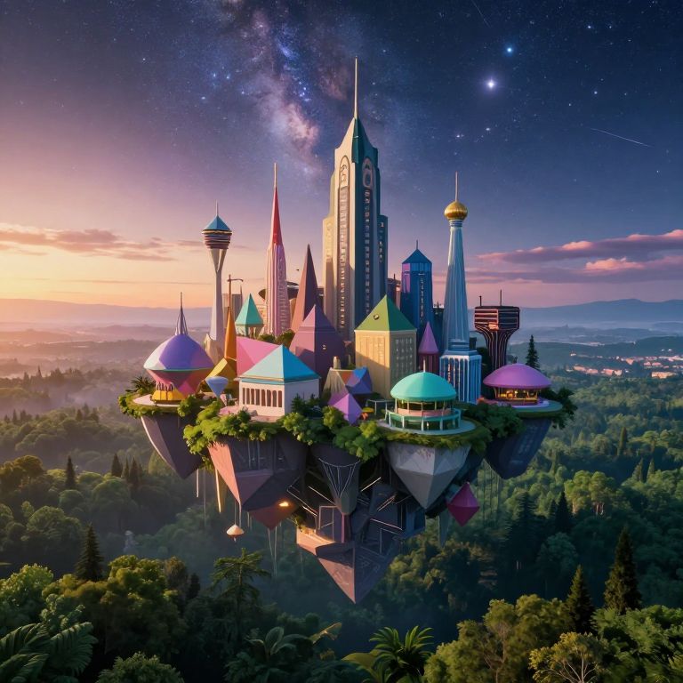 A dreamlike landscape inspired by whimsical artistry, featuring a floating city composed of geometric shapes and futuristic architecture suspended above a verdant forest. The scene is viewed from an aerial perspective, capturing the vibrant hues and ethereal beauty of the juxtaposed elements as night falls. The sky transforms into a tapestry of stars and galaxies, illuminating the whimsical scene with an otherworldly glow that evokes both wonder and serenity.