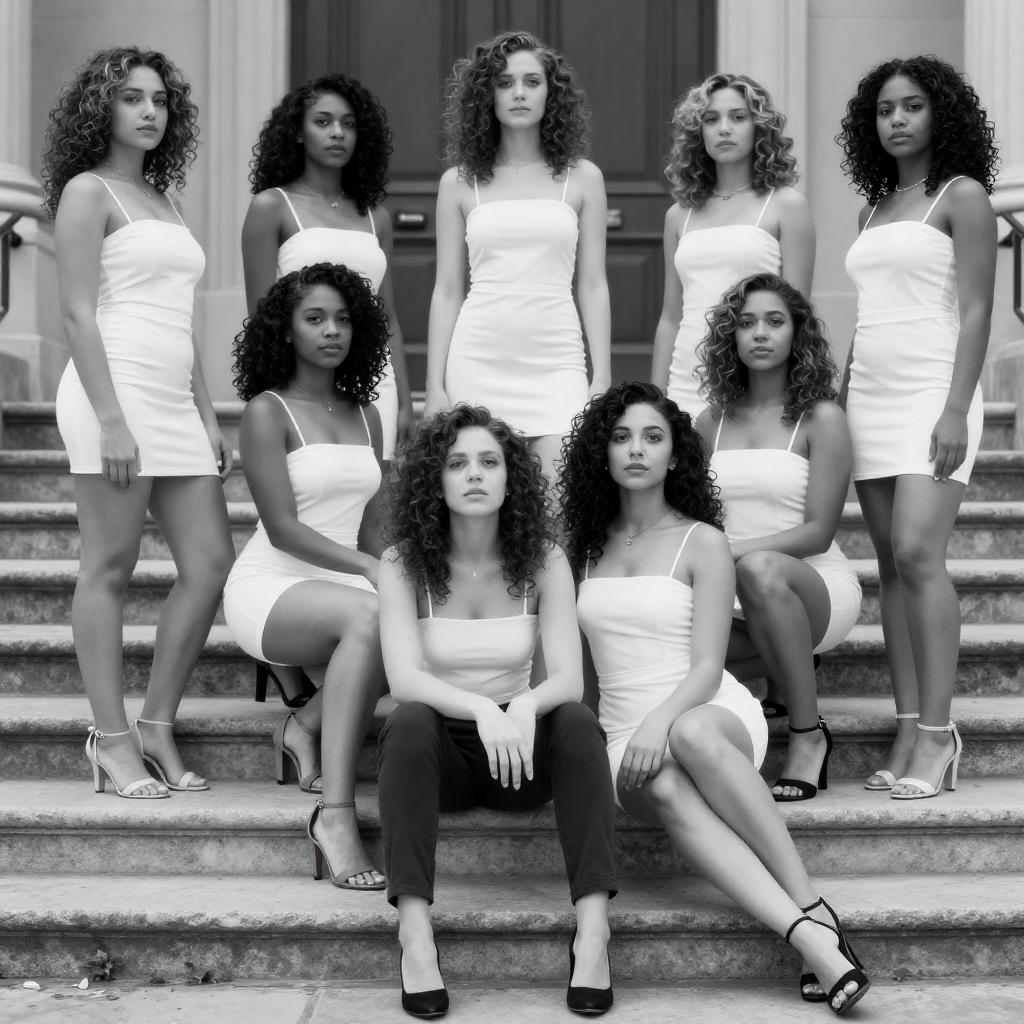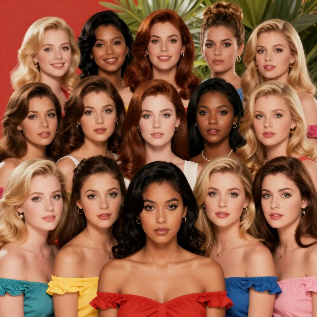 Movie poster with a group of ten women with various hairstyles, makeup, and clothing, closely arranged. Bright red background on the left, green foliage in the background. Women have diverse expressions, from smiling to neutral. Blonde, brunette, and black-haired women. Women in the front wear strapless and off-shoulder tops. Central black-haired woman has a serious expression. Women in the back have lighter hair, some with waves, others straight. Bright, colorful, retro style.