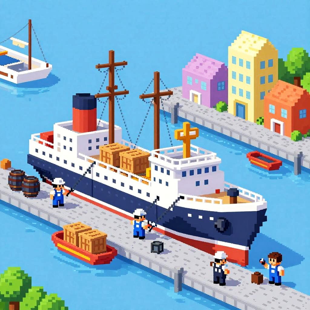 Pixel art ship docked at a bustling pixel harbor, with crates, barrels, and pixelated sailors working, colorful pixel buildings in the background, clear blue sky, detailed with tiny pixel sprites and bright palette.