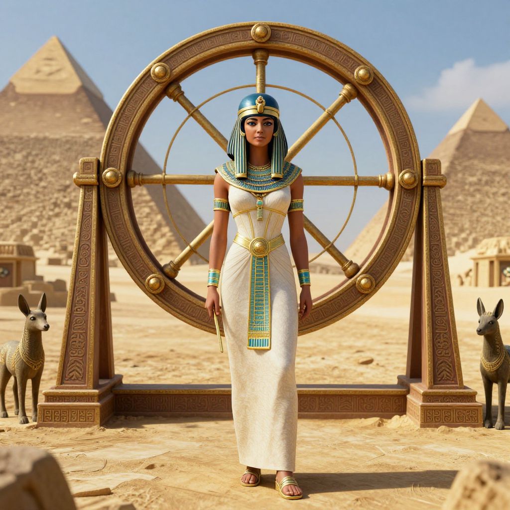 Digital artwork of an Egyptian woman in a white dress and blue headpiece, standing before a large wooden wheel in front of pyramids, with two jack