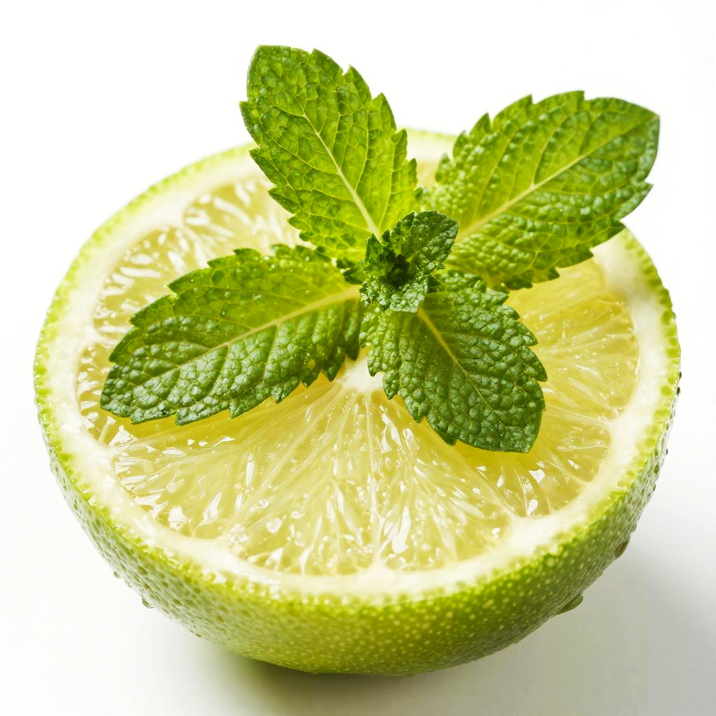 A close-up photo of a fresh lime slice with bright green zest and juicy, yellow-tinted flesh. Atop the lime slice sits a cluster of vibrant, dark green mint leaves. The background is pure white, making the lime and mint stand out sharply. The image has a high contrast and vivid colors, emphasizing the freshness of the ingredients.