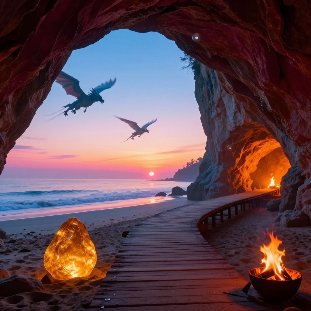 A mesmerizing sunrise, city, beach, flying dragons, snow, cave entrance glowing with light from the inside, wooden bridge, a single golden rock formation, water droplets, lit by natural glow, glowing rock, natural light, sunlight, scintillating bonfires, torcheseverything looks perfect, good vibes, positivity, most beautiful picture in the world, <8k, high detail, uhd, sharp focus, palette, photorealistic, absurdres, extreme detail, as much detail as possible, extremely high visibility>, matte maroon, muted azure, bright orange, bright pink, matte teal