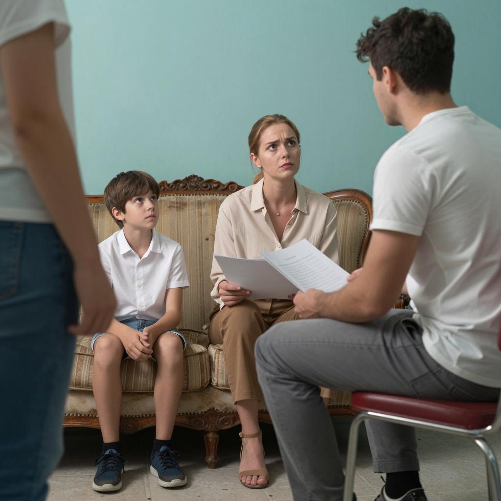 Photograph of a woman and a young boy in a small kitchen. Woman with dark hair, purple dress, sitting at table, leaning on arm. Boy with blonde hair, blue shirt, orange drink, seated across from her. Microwave, toaster, fruit, plates on counter. White tiled walls, white refrigerator. Woman looks serious, boy looks curious.